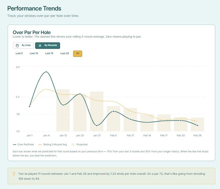 That’s enough to create a reliable baseline for golf improvement tracking, even if you don’t play full 18-hole rounds every time.